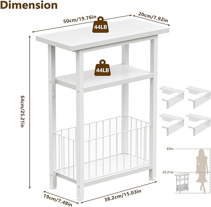 • [Space Saving & Extra Storage] Product Size: 7.9"D x 19.8"W x 25.2"H. Great Designs for Tight Spaces, The widened top shelf offers more space to hold a lamp, photo frame, coffee, etc. especially for use as a sofa side table or slim nightstand. This narrow side table takes up a small amount of space, but still has plenty of room for storage. You can put your cell phone, coffee mugs on the top shelves, and books like magazines in the center and bottom