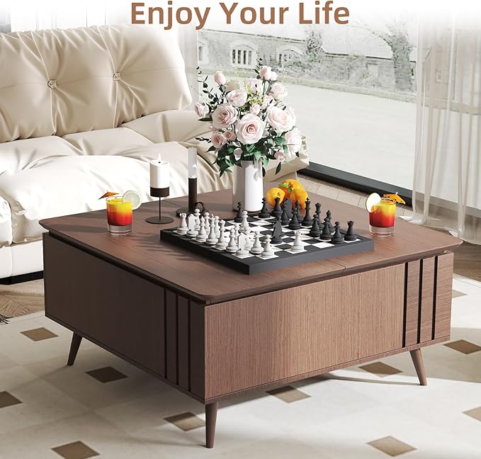 • Smart Lift-Top Functionality: This lift top coffee table features a convenient pop-up design on one side for laptop work or casual dining, while the other side opens to hidden storage. A perfect coffee table with storage for today’s multi-tasking living rooms