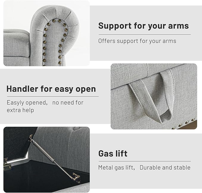 • ·Top-quality Planks&Sophisticated Mechanics: The ottoman bench frame made of multi-layer solid wood planks offers excellent breathability, durability, and support. The easy-lift and soft-close mechanism of the composite hinge and support arm structure ensures that the seat surface opens smoothly. It allows for easy and slow closure, providing a safe and effortless user experience.