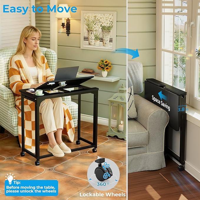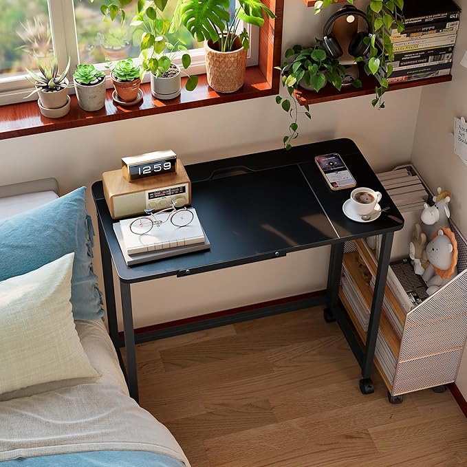 GreenForest Folding Desk with Adjustable Tiltable Desktop 0-90°, 31.5 inch Small Desk with Wheels, Rolling Drafting Table for Laptop, Reading, Writing, Drawing, Work, Black