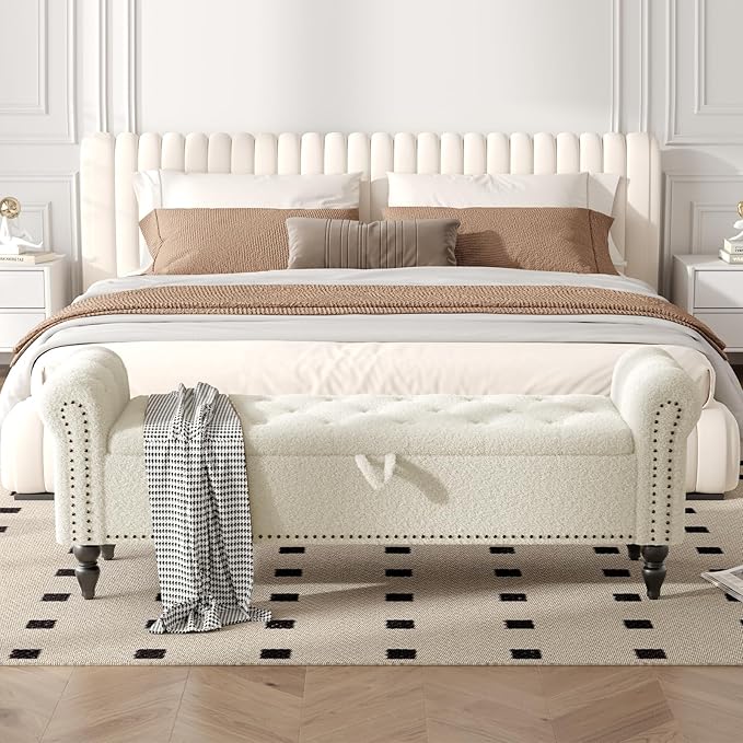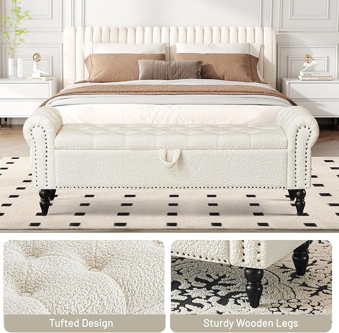 • ·Modern Design: Our storage ottoman showcases deep button tufting and elegantly rolled arms, capturing the essence of a truly modern piece. With a sophisticated structure, this bedroom storage bench embodies a minimalist style that prioritizes comfort and practicality.Diamond Stitch Button Tufting: The button-tufted stitching on the lid enhances the modern designthis of this end of bed bench. The diamond stitch pattern introduces subtle texture while maintaining optimal comfort.