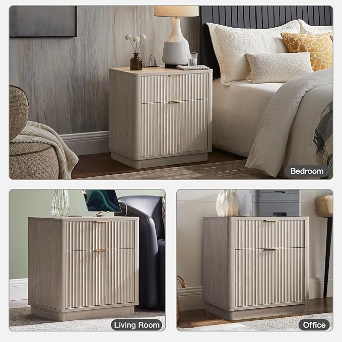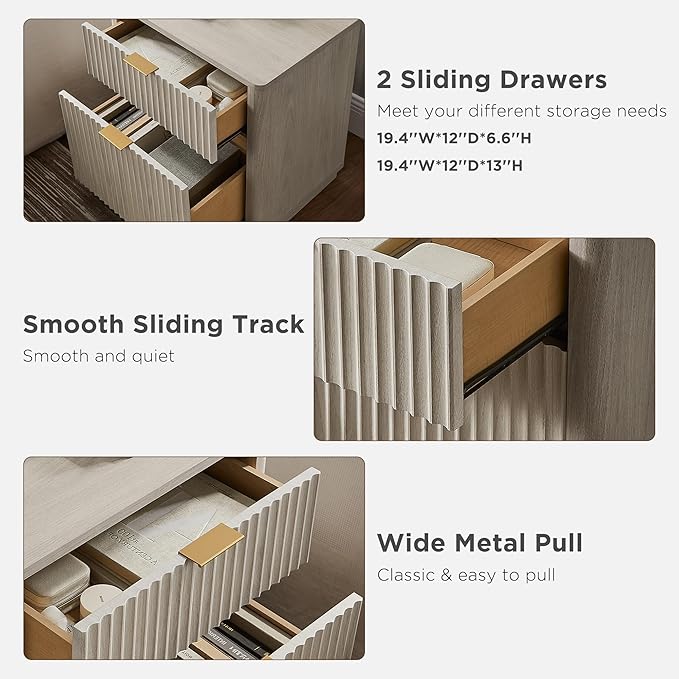 • Modern and Functional Style – Featuring a sleek, curved profile and 2 sliding drawers with a distinctive fluted wave pattern, this nightstand combines minimalist style with practical functionality. Its chic design blends seamlessly with various bedroom aesthetics, from contemporary to mid-century modern, while the rounded edges ensure safety for kids and families.
