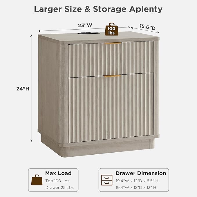 T4TREAM 23'' Fluted Nightstand with Charging Station, Large 2 Drawer Side Table, Modern End Table with Storage, Mid Century Bedside Table for Bedroom, Living Room, Curved Profile, White Alder