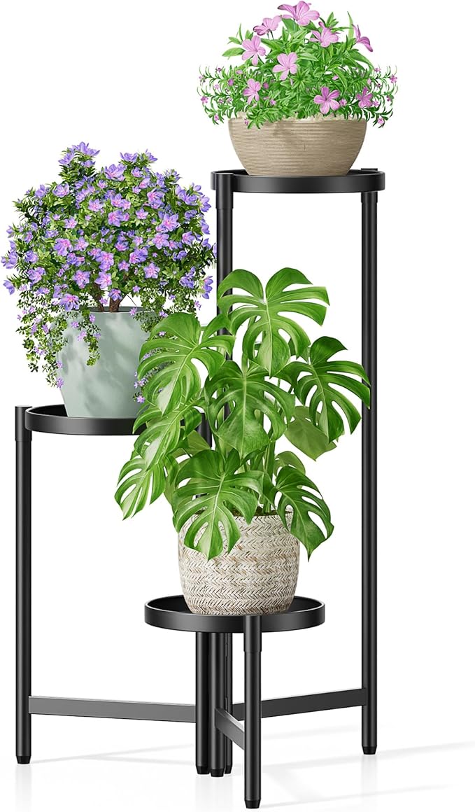 3 Tier Large Plant Stand Indoor with 10 Inch Wide Tray, Tiered Corner Metal Outdoor Flower Holder Stand, Folding Tall Rack for Display Shelf for Patio Porch Balcony - BlackDisk