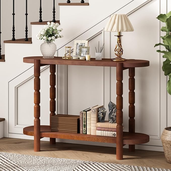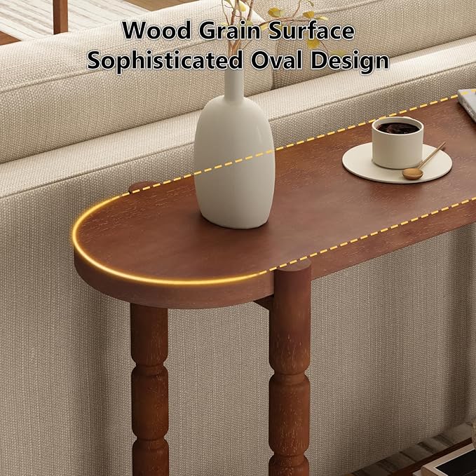 • Farmhouse Style with Rounded Corners-Enhance your home with the perfect blend of farmhouse charm and mid-century modern style. This wood console table is defined by its smooth rounded corners and elegant hand-carved legs, creating a distinctive look that adds artistry and character to any room.