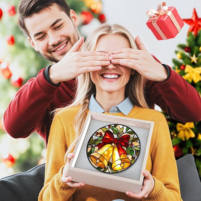 • 【Classic Golden Christmas Bells Design】Ring in the holiday season with this elegant stained glass suncatcher! Featuring a pair of glowing golden bells tied with a lush red bow and accented with holly leaves and berries, this stained glass window hanging brings a piece of traditional Christmas charm and sparkle to your home decor