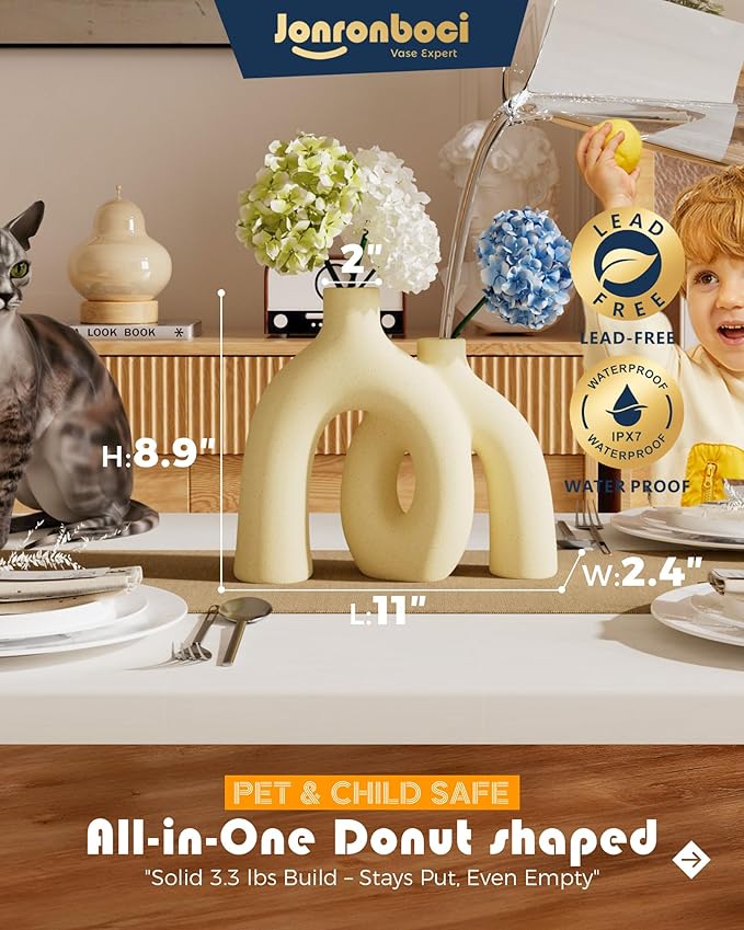 Hug Donut Decorative Vase Set - Beige Vase, Modern Nordic Boho Style Vases Home Decor, Matte Ceramic Decorations for Living Room Shelf, Bookshelf Mantle Entryway Table or Console Décor (Beige)