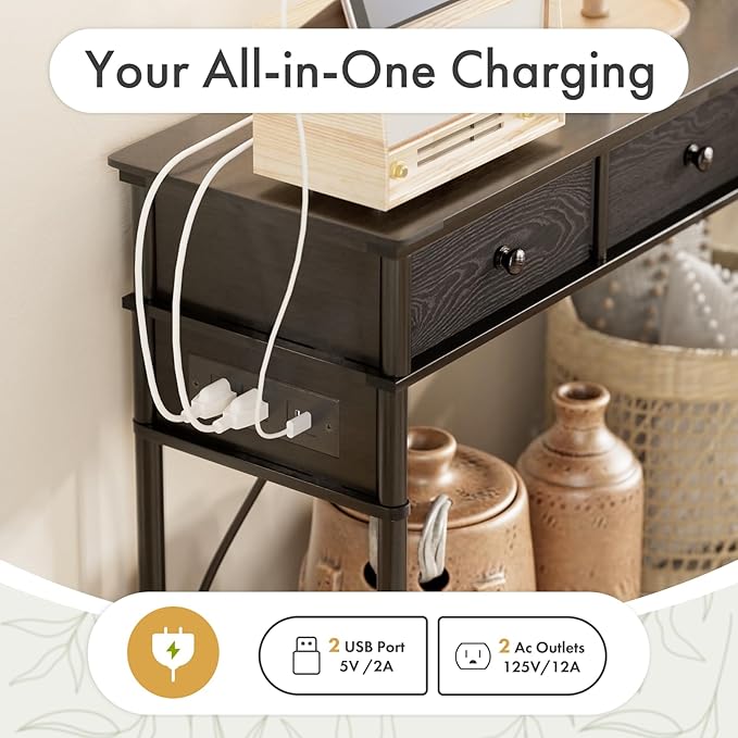 • Console Table with Outlet: This console table provides 2 USB ports and 2 regular outlet. You can install a power strip on the side of the console table as needed for convenient charging without taking up space. Cable routing is also included on both sides of the shelf to keep the room clean and tidy