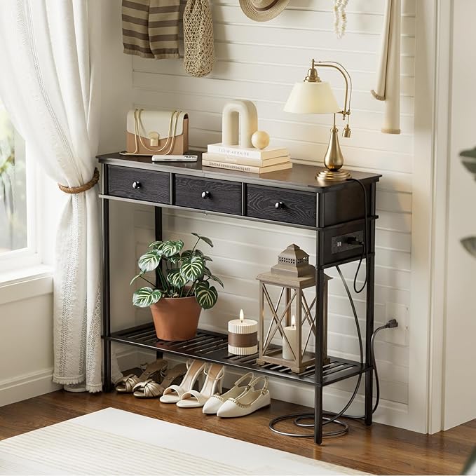 Entryway Table Sofa Console Table, Bamboo Small Entry Way Table with Drawers Storage and Power Outlets for Living Room, Hallway, Foyer, Entrance, Black