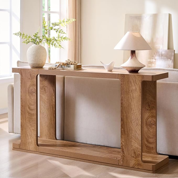 • Modern Design with a Touch of Elegance: Featuring clean lines and a minimalist aesthetic, this wood console tables for entryway combines natural wood textures with elegant curved edges and a base adorned with subtle inlaid lines. Its timeless design effortlessly complements modern decor, adding a touch of sophistication to your home. The attention to detail, including the rounded corners, enhances its visual appeal while maintaining a refined, contemporary look