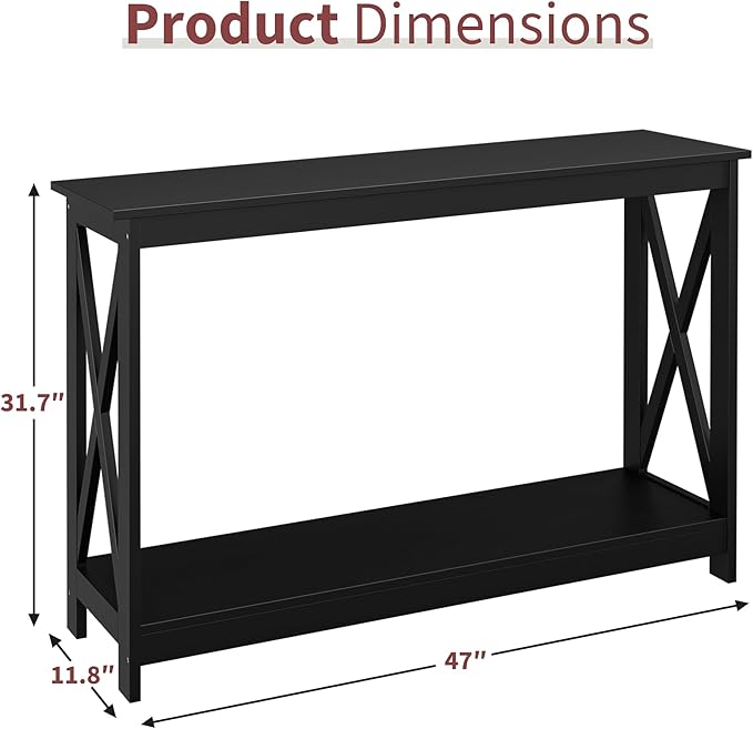 • 【Quality Materials】-- This entryway table is made of high quality 0.6" thick MDF shelves and solid wood legs, the whole console table is sprayed with eco-friendly powder coating, sturdy and stable. The X-frames on both sides not only adds a stylish touch, but also provides stronger support for sturdiness, hold up to 110 lbs per shelf. Anti-tipping design also for added safety, it won't tip over