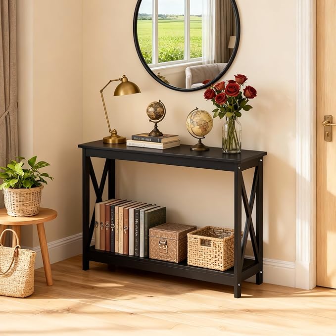 • 【2-Tier X-Design Console Table】-- Featuring 2-tier shelves provides ample storage and display space for placing your books, collections, plants and other every day necessities. This simple yet sturdy console table is sure to complement any Décor