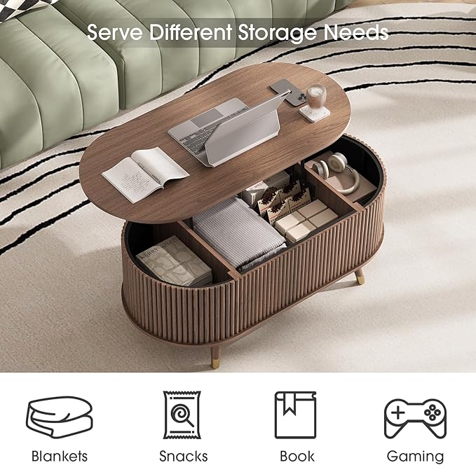 • Hidden Storage for Everyday Essentials: This storage coffee table is designed with a generous hidden compartment in the oval coffee table, perfect for keeping books,remotes,and daily items neatly out of sight.Enjoy a clutter-free living space without compromising the sleek design of a modern coffee table