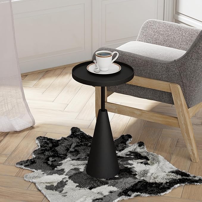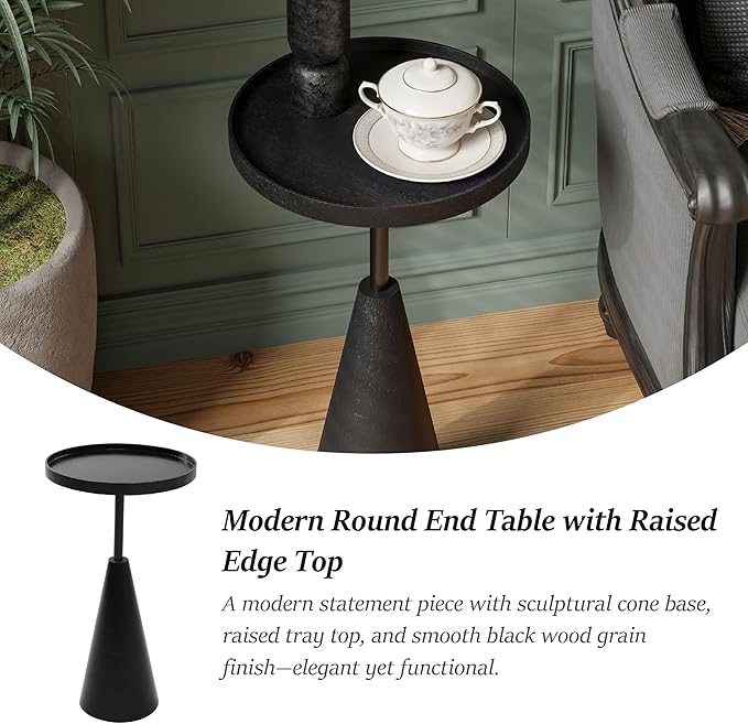 • ✅【Sleek yet Minimalist】: Featuring a round tabletop and conical base in a matte black wood finish, this end table embodies clean lines and balanced geometry for a refined modern aesthetic.