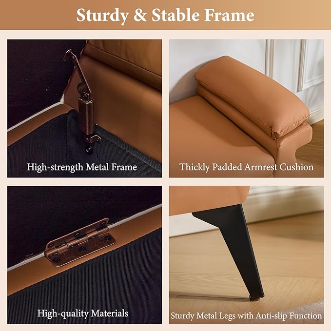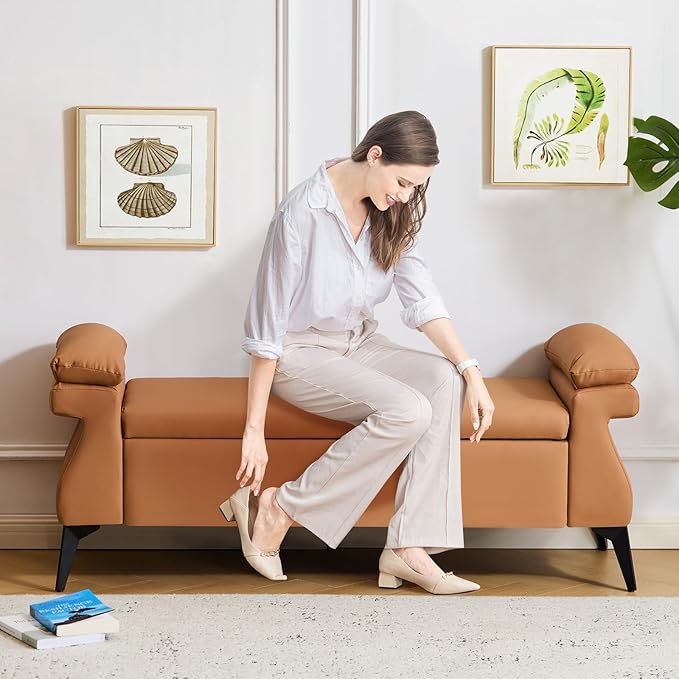 • ·Modern Design: Our storage bench features armrests with cushions, which are completely different from other conventional storage benches. It fully considers the user's experience and perfectly embodies the essence of true modern style. Its exquisite structure makes this bedroom storage bench reflect a minimalist style, emphasizing comfort and practicality. The entire end table of the bed is covered with a comfortable one-piece Fuax leather fabric, enhancing the modern design of this end table for the bed. The thick cushions on the armrests bring a unique innovation while maintaining a high level of comfort.