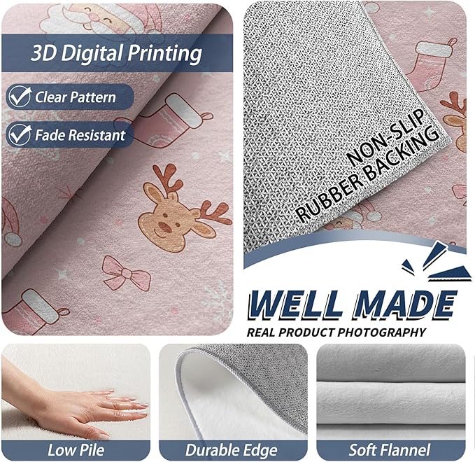 • Non-slip & Non-shedding: The Cartoon Xmas washable rugs are made with a non slip TPR rubber backing that grips securely on a variety of floor surfaces including tile and hardwood floors. Reinforced overlock edges ensure virtually no shedding and durability